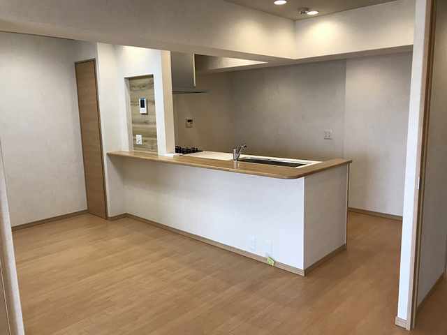 今回の物件はとても使い込まれており内装はかなり傷んでいました。 まず二間続きになっている和室はリビングを拡張するために一間を削りました。それにより、3LDから2LDKとなりましたがリビングダイニングを18.0帖と広くとることができました。フローリングと建具を総入替えし、全室優しい色味のミルベージュで統一したことでお部屋全体も明るい印象となっています。和室だった面影は微塵も感じさせません。 キッチンと浴室・洗面室の配置替えをし、もともと独立キッチンでしたがカウンターキッチンへ変更しています。生活導線をしっかり確保しつつ、ご家族との交流時間も増えそうな間取りです。 さらに玄関から廊下にかけての壁にはエコカラットを施工したので壁紙とは違った印象で新鮮ですよ。 さらにシステムキッチン、洗面室、浴室、靴箱入替え。ダウンライト新設、建具の全箇所取替えを行いフルリノベーションしました。 また、各室に収納を確保して使いやすくしました。 現場名:サンシティ須磨名谷 リノベーション工事 所在地:神戸市須磨区東落合2丁目